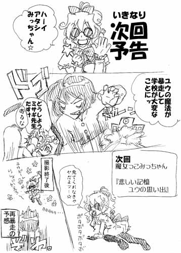 いきなり次回予告~魔女っこみっちゃん チラシの裏メモ 2009年02月01日 いきなり次回予告「魔女っこみっちゃん」画像サイズちょっとでかいので、携帯から見るときはご注意をば。いきなり次回予告で遊んでたら描きたくなって落書きっちょしてみました。三人分の名前を入れてボタンをぽちっと押すだけでおもろい次回予告ができます。ちなみに私は「蒼の魔法士」という小説に出てくるキャラを使って遊んでます。あまりにおもろいんで、「蒼の魔法士」モバイルサイト(URL:http://keita.obunko.com/)にいくつか掲載してみました。 ◆仕神けいたの活動報告 FANBOXとクリエイティアで活動報告をしています。 FANBOXではVroid系・イラストを、クリエイティアでは、執筆関連の報告や仕神の執筆環境などの報告をします。 どちらも会員限定の情報がありますので、ご興味ありましたらどうぞ!