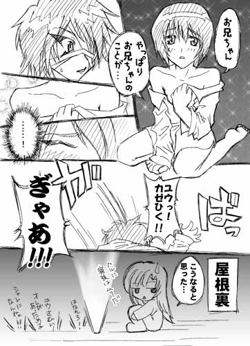 いきなり次回予告~なんか注意報出てる チラシの裏メモ 2009年02月02日 またまたいきなり次回予告で遊んできました。微エロ(?)注意報。いや、普段描かない内容だからエロなのかどうなのか判断できず。【いきなり次回予告】「お兄ちゃん…やっぱり…お兄ちゃんのことが…」月下に浮かび上がる義妹ユウの幼い肢体。兄ハルは、その白い素肌に目を奪われた。「いけない…」そう思いつつも、ユウの唇はハルを求める。屋根裏で二人を窺うミサギの気配に気付かずに…。いっかつ浪漫ぽるの第一弾!【ハルの口唇】好評上映中!……てのをもとに落書き漫画をば。画像サイズ、240x320より大きいです。次回予告どおりに描くつもりのはずが、ハル(お兄ちゃん役)の突っ走りによりおじゃんになりました。屋根裏でスタンバってたミサギさん、すげーつまんなさそう(笑。 ◆仕神けいたの活動報告 FANBOXとクリエイティアで活動報告をしています。 FANBOXではVroid系・イラストを、クリエイティアでは、執筆関連の報告や仕神の執筆環境などの報告をします。 どちらも会員限定の情報がありますので、ご興味ありましたらどうぞ!